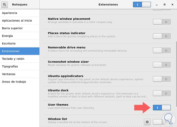sudo apt install gnome-shell-extensionsEsta extensión contiene entre 8 a 10 extensiones útiles, incluida la que le permitirá cambiar el tema del shell de GNOME. Ahora, si accedemos de nuevo a la herramienta Retoques podemos activar el interruptor User themes en la sección Extensiones: