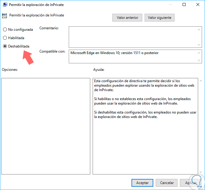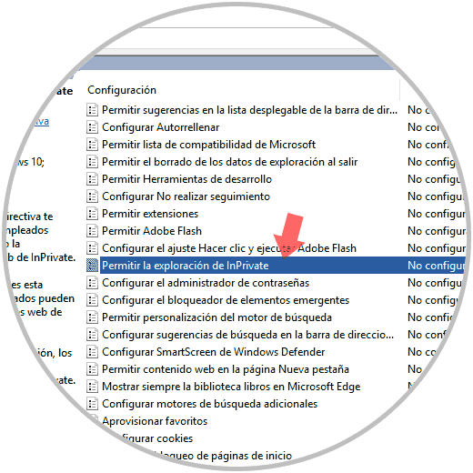 Allí debemos ubicar la política llamada “Permitir la exploración de InPrivate”: