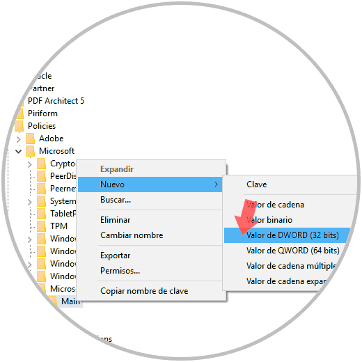Ahora, daremos clic derecho sobre la nueva clave creada y de nuevo seleccionamos la opción Nuevo / Clave y esta clave será llamada “Main”. Posteriormente daremos clic derecho sobre “main” y seleccionamos la opción Nuevo / Valor de DWORD (32 bits):