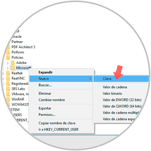 Allí daremos clic derecho sobre la clave “Microsoft” y seleccionamos la opción Nuevo / Clave: