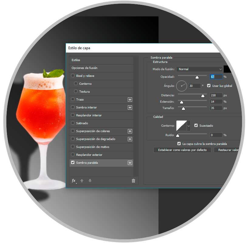 Desde aquí seleccionamos “Sombra paralela” y damos los parámetros según veamos que se crea la sombra que queramos intentando que sea lo más real posible. Usa la opción de “Distancia” en valor alto para ver mejor la sombra, Después aplica los cambios en Ok.