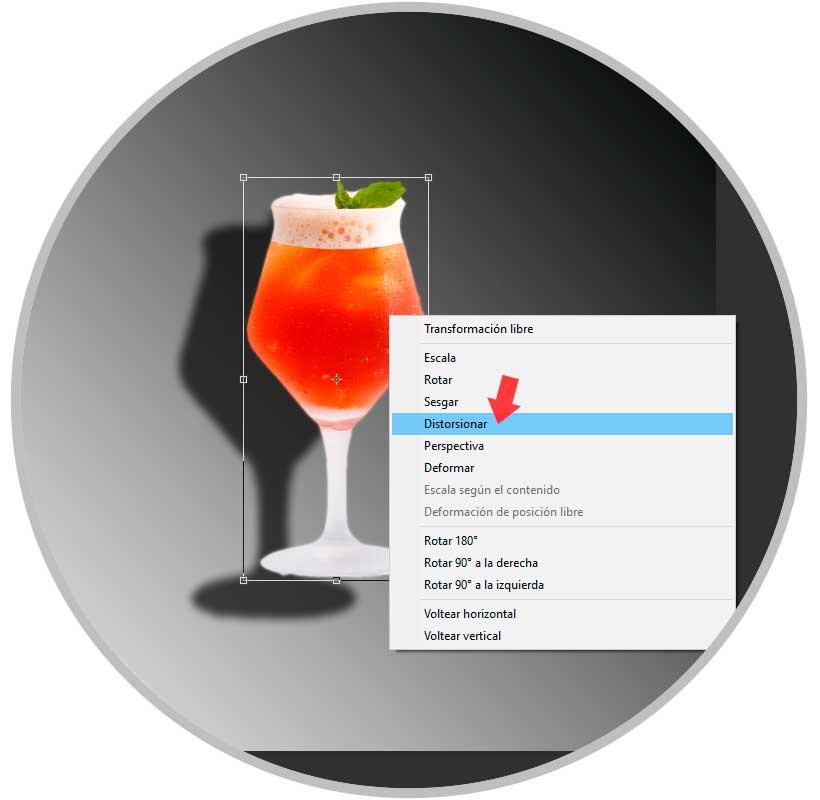 Ya tenemos lista nuestra capa de sombra para editar. Ahora realiza la siguiente combinación de teclas para entrar en el modo Transformar y haz clic derecho sobre ella y “Distorsionar”. Colócala según el efecto que busques.