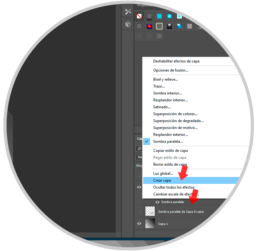 Ve al efecto de sombra en la capa que habíamos duplicado y haz botón derecho y “Crear capa”.