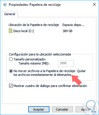 En la ventana desplegada seleccionaremos la unidad donde se aplicará el cambio, activamos la casilla “No mover archivos a la Papelera de reciclaje. Quitar los archivos inmediatamente al eliminarlos” y pulsamos en el botón “Aplicar” para guardar los cambios: