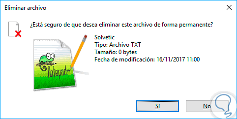 Al usar esta combinación veremos un cuadro de diálogo de confirmación en la pantalla que nos preguntará si deseamos eliminar el archivo permanentemente. Simplemente, daremos clic en el botón Sí y el archivo o carpeta seleccionada se eliminará permanentemente del equipo sin tener que ir a la papelera de reciclaje.