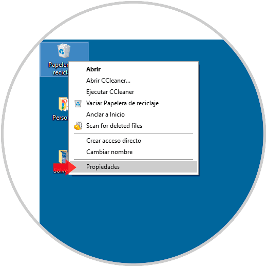 Para esto, daremos clic derecho sobre el acceso directo de la papelera de reciclaje en el escritorio y seleccionamos la opción “Propiedades”: