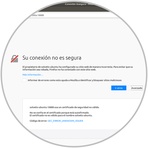 https://Direccion_IP:10000 https://Nombre_Equipo:10000Veremos lo siguiente asociado al error del certificado: