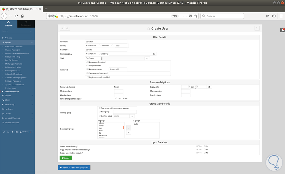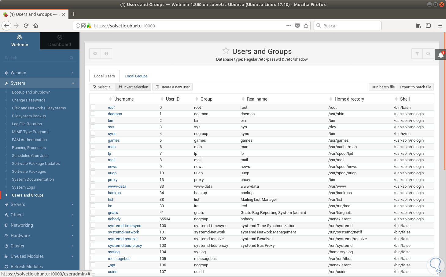 3. Cómo usar Webmin en Ubuntu 17: Administración de usuarios y grupos