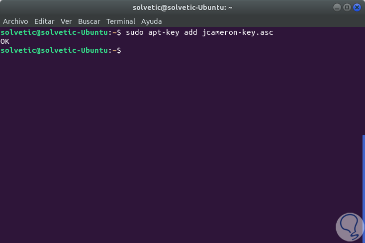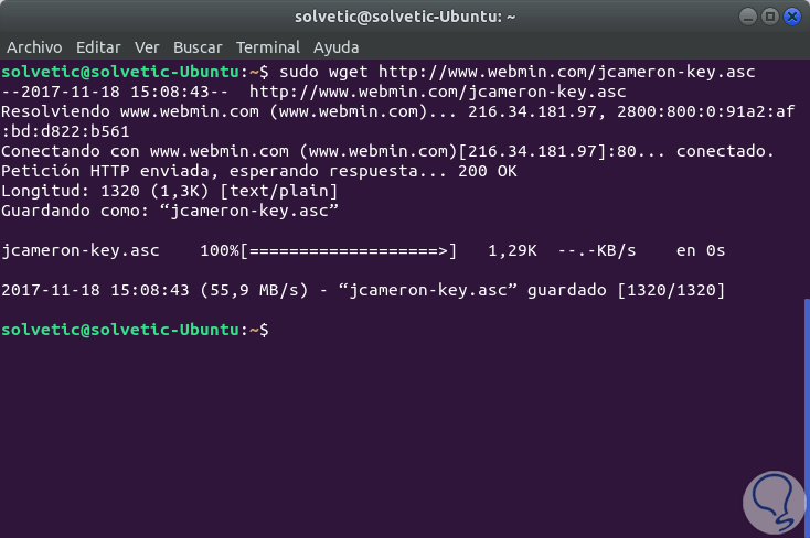 Guardamos los cambios usando las teclas Ctrl + O y salimos del editor usando las teclas Ctrl + X. A continuación, agregaremos la clave PGP de Webmin para que el sistema confíe en el nuevo repositorio, ejecutaremos lo siguiente:
