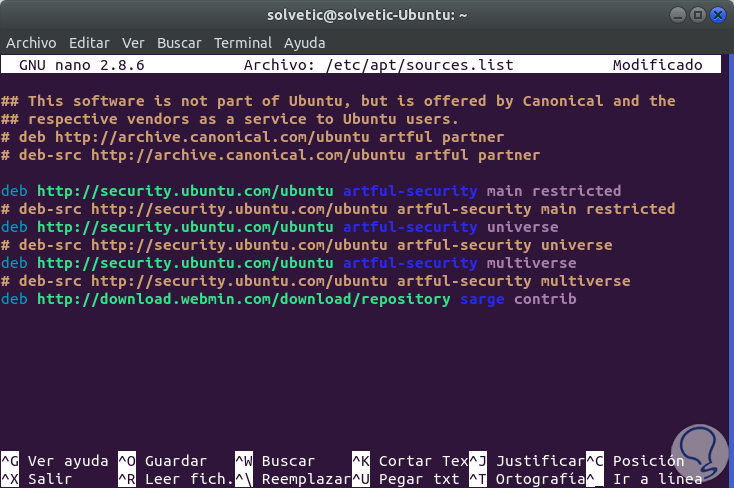 sudo nano /etc/apt/sources.listAllí agregaremos la siguiente línea al final del archivo: