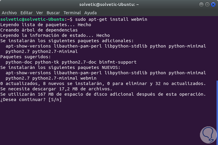 Ingresamos la letra S para confirmar la descarga e instalación de los paquetes y una vez finalice este proceso veremos lo siguiente: