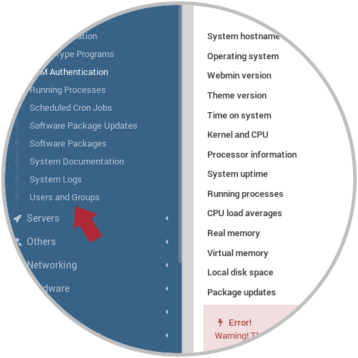 Webmin es una herramienta completa que nos permite administrar diversos parámetros del sistema de forma detallada. Para administrar usuarios y grupos vamos a la sección System y allí elegimos la opción Users and Groups: