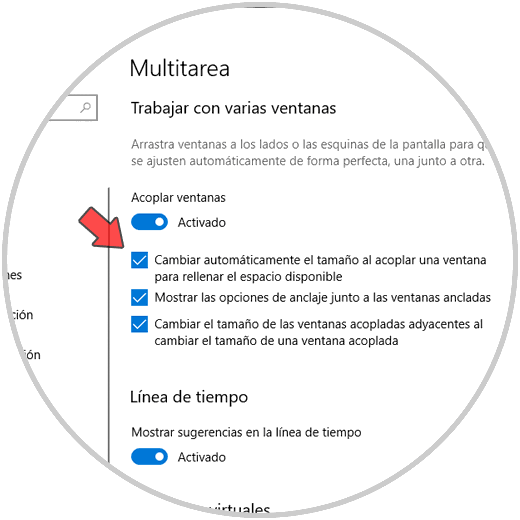 Si quieres deshabilitar que Windows ajuste de manera automática el tamaño de las ventanas en multitarea, debes pulsar el interruptor que pone la opción de “Cambiar automáticamente el tamaño al acoplar una ventana para rellenar el espacio disponible.