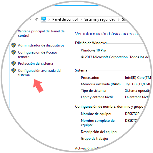 Para acceder a esta opción iremos a la siguiente ruta. Allí seleccionamos la línea “Configuración avanzada del sistema” ubicada en el costado izquierdo.