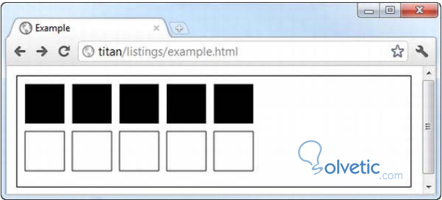 Hemos hecho dos filas de 5 rectángulos cada uno, si nos fijamos en el código habíamos llamado a los métodos fillRect() primero para los rectángulos rellenos y luego a strokeRect para los no rellenos.