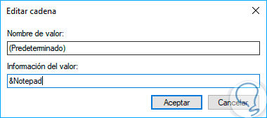 Ahora, vamos de nuevo al editor de registros y damos doble clic sobre el valor predeterminado en la clave “command” y pegamos la ruta en el campo “Información del valor”: