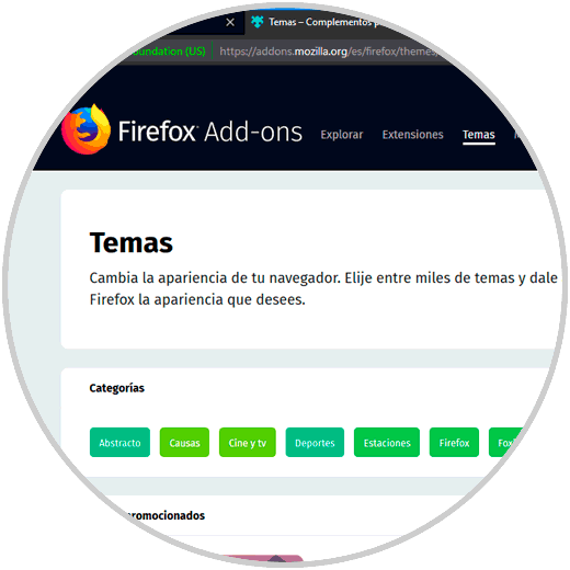 Si deseamos obtener nuevos temas, daremos clic sobre la línea “Obtener más temas” y será desplegada la ventana de complementos de Firefox Quantum donde podremos seleccionar temas por diversas categorías y aplicarlos al navegador: