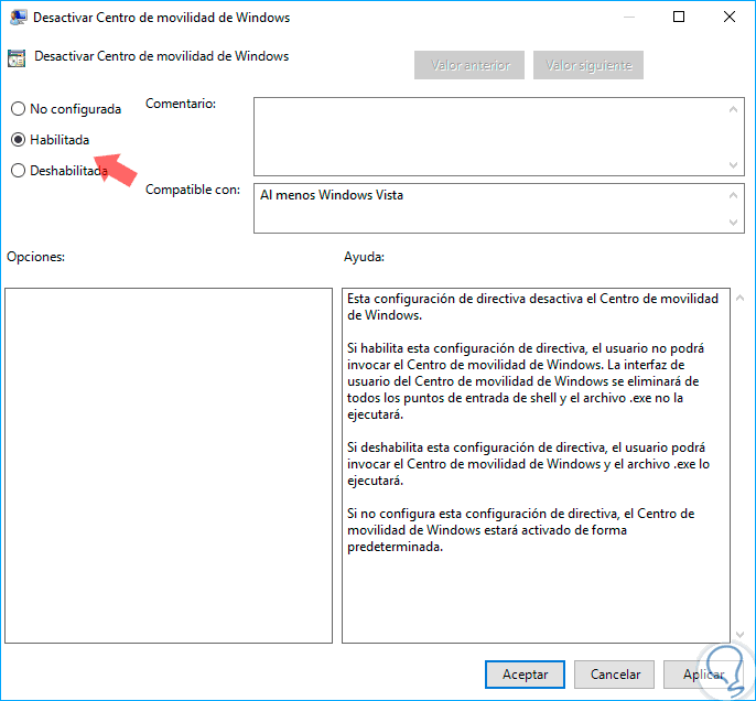 Podemos ver que solo existen una política dentro de ella, damos doble clic sobre esta y en la ventana desplegada activamos la casilla “Habilitar”. Pulsamos en aplicar y aceptar para guardar los cambios.