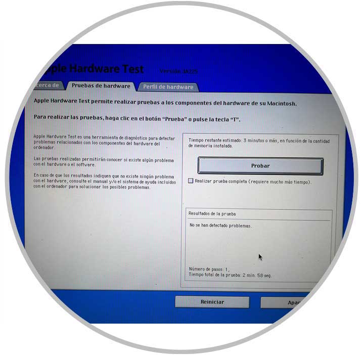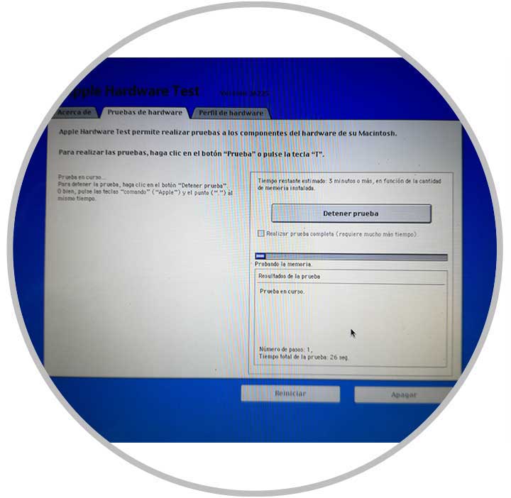 Para iniciar las pruebas de validación del hardware en macOS pulsamos sobre el botón probar y, si deseamos, podemos activar la casilla Realizar prueba completa, para que el análisis sea mucho más exhaustivo.