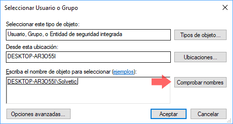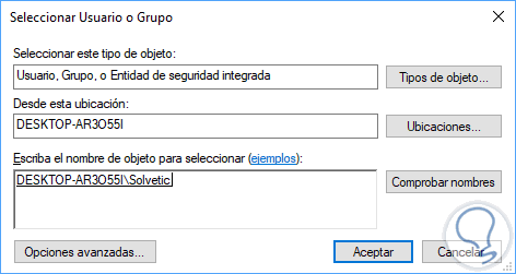 y en la ventana emergente ingresaremos el nombre de alguna cuanta activa y con permisos de administrador en Windows 10 y pulsamos sobre "Comprobar nombres" para que el sistema la detecte automáticamente: