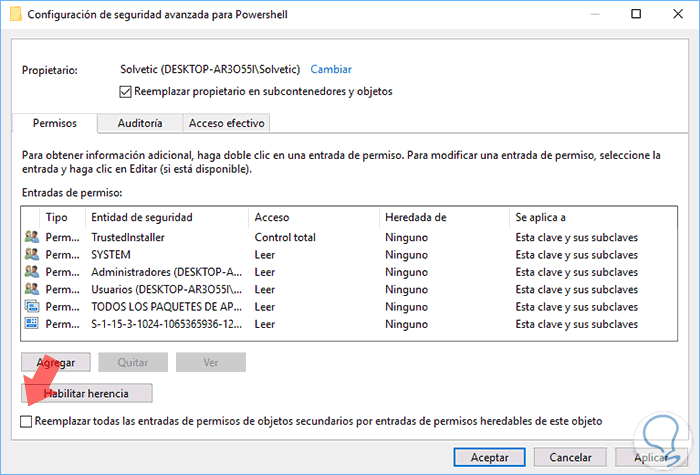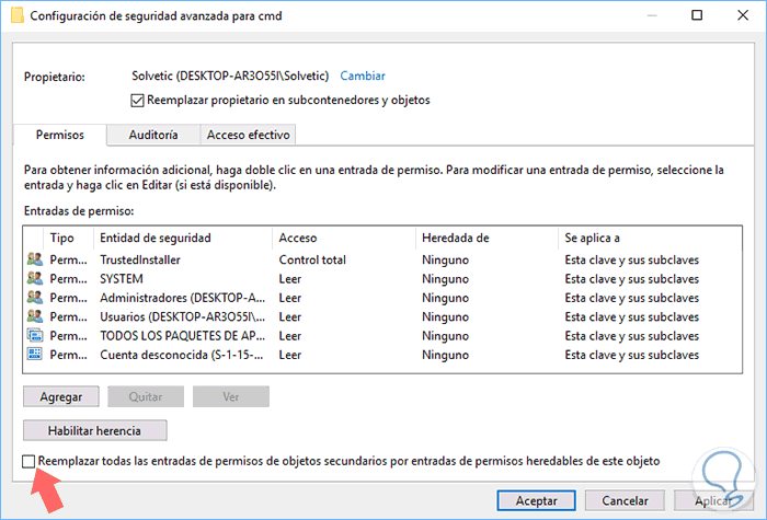 Pulsamos en Aceptar y veremos que el propietario ha sido modificado, allí debemos activar la casilla "Reemplazar propietario en subcontenedores y objetos" para que el cambio sea íntegro. Pulsamos en Aplicar y Aceptar para guardar los cambios.