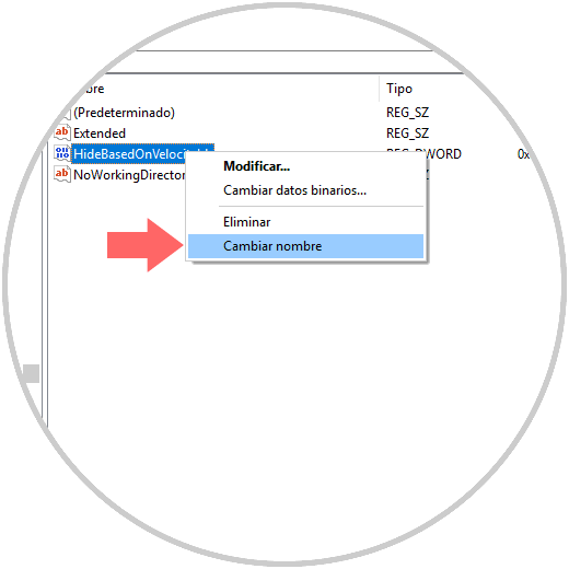 De nuevo pulsamos en Aplicar y Aceptar. Ahora, seleccionamos la clave cmd y daremos clic derecho sobre el valor DWORD llamado HideBasedOnVelocityId y elegimos la opción Cambiar nombre: