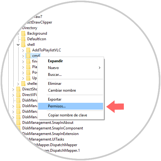 Allí daremos clic derecho sobre la clave cmd y seleccionamos la opción Permisos: