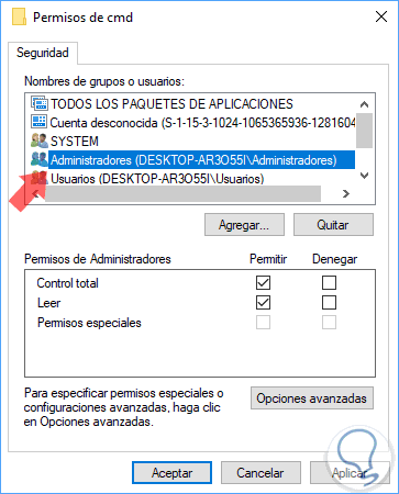 Quedará abierta la ventana de permisos de cmd, allí seleccionamos al grupo Administradores y activamos la casilla Control total en la parte inferior: