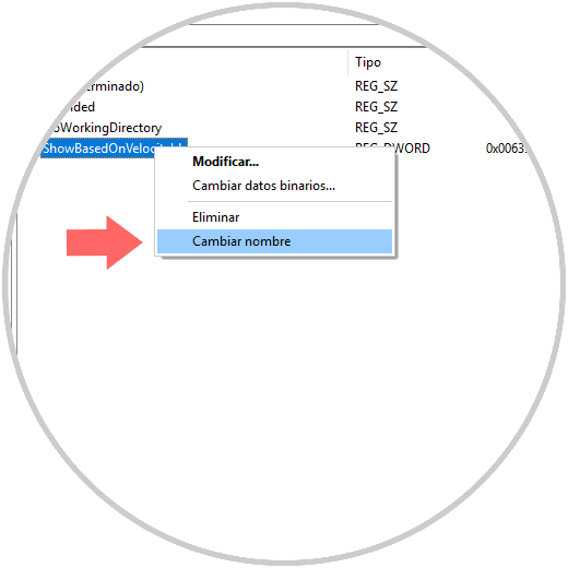 Dentro de la clave PowerShell daremos clic derecho en el valor DWORD llamado ShowBasedOnVelocityId y seleccionamos la opción Cambiar nombre: