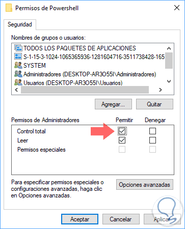Pulsamos en Aplicar y Aceptar para completar el proceso. A continuación seleccionaremos el grupo Administradores y le daremos control total a la clave. Pulsamos nuevamente en Aplicar y Aceptar.