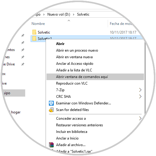 C:\Users\Solvetic (ruta habitual) C:\WINDOWS\system32> (ruta como adminsitradores)Como hemos visto esta opción de Abrir ventana aquí no siempre está presente pues puede venir deshabilitada por defecto o bien hemos modificarlo alguna característica que nos lo haya ocultado. En el siguiente manual podrás comprobar los pasos para poder abrir la ventana de comandos desde aquí, es decir, desde una ubicación concreta de diferentes formas.