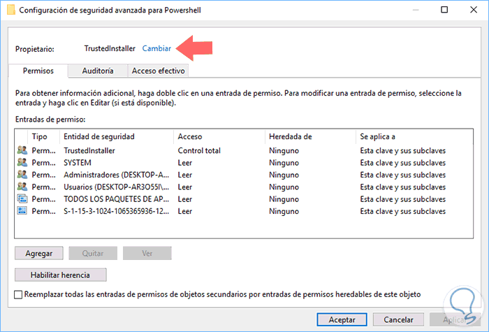 Pulsamos sobre el botón "Opciones avanzadas" y se desplegará la siguiente ventana. Allí damos clic sobre la línea Cambiar ubicada en la parte superior en la sección Propietario