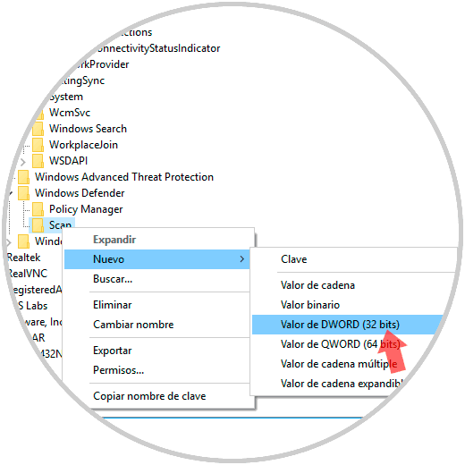 Esta clave la llamaremos Scan. Ahora, daremos clic derecho sobre Scan y seleccionamos Nuevo / Valor de DWORD (32 bits):