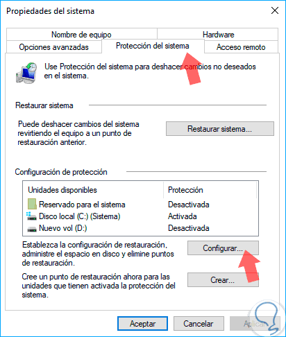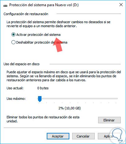 Allí podemos seleccionar la unidad que esta como Desactivada y pulsar en el botón Configurar, veremos lo siguiente donde será necesario pulsar en la casilla “Activar la protección del sistema”.