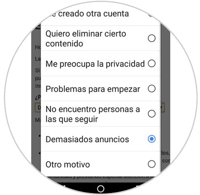 Deberás seleccionar el motivo por el que quieres eliminar tu cuenta de Instagram. Para ello pulsa en la flecha de la esquina y se desplegarán todas las opciones disponibles. Selecciona el motivo por el que quieres eliminar tu cuenta de Instagram para continuar.