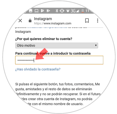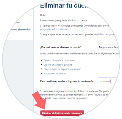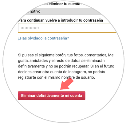 Allí debemos indicar algún motivo por el cual se ha de eliminar la cuenta de Instagram, debemos ingresar la contraseña actual de la cuenta y pulsar en el botón "Eliminar definitivamente mi cuenta":