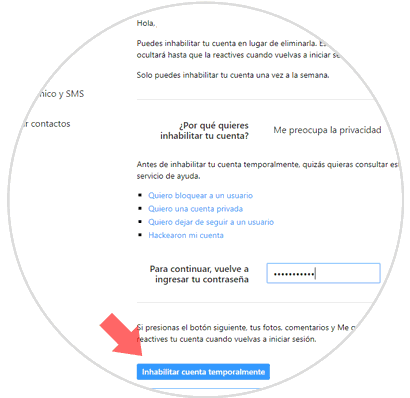 En la ventana desplegada indicaremos nuevamente una razón y seleccionamos el botón "Inhabilitar cuenta temporalmente". Para habilitar de nuevo la cuenta basta con iniciar sesión y listo.