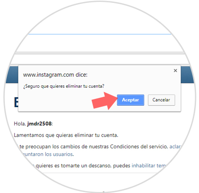 Se desplegará el siguiente mensaje: Pulsamos en "Aceptar" para proceder con el cierre definitivo de la cuenta de Instagram. Así se eliminará la cuenta usando este método efectivo de forma permanente.
