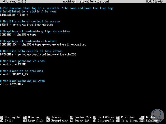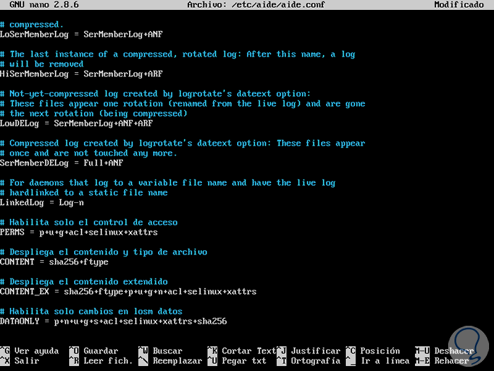 DATAONLY = p+n+u+g+s+acl+selinux+xattrs+sha256Estas reglas las debemos añadir en la parte inferior del archivo de configuración de AIDE: