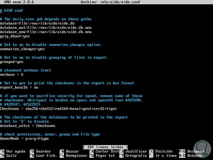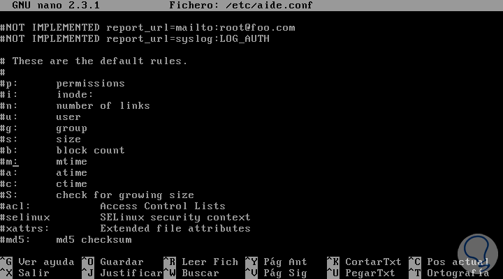 nano /etc/aide/aide.confVeremos lo siguiente: