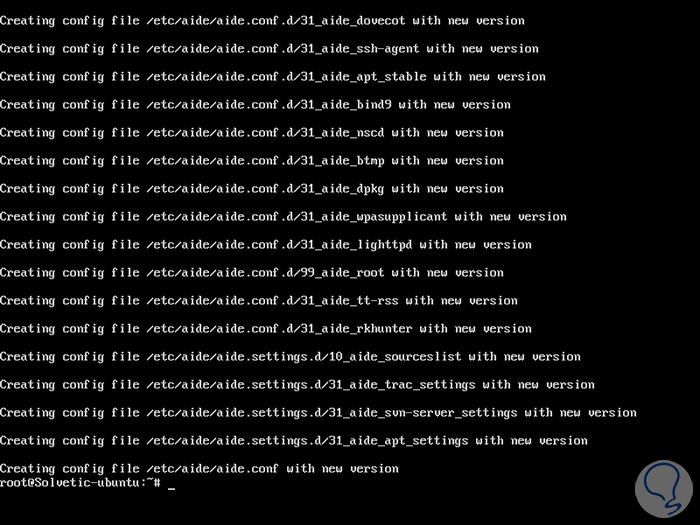 A continuación, debernos compilar un nuevo archivo de configuración de Aide. Ejecutamos el siguiente comando: