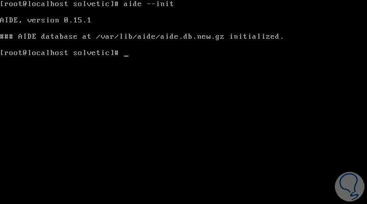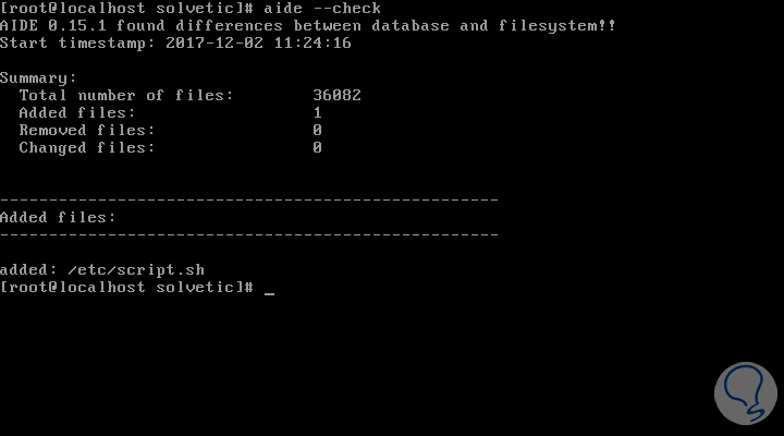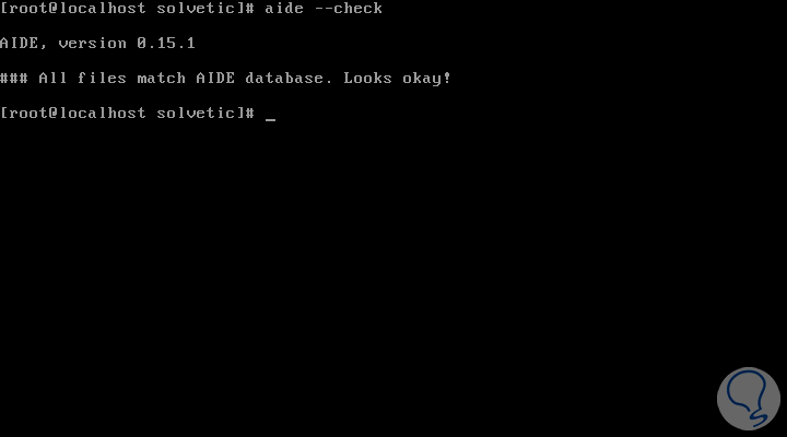 mkdir /root/aide-test touch /root/aide-test/testsolvetic touch /root/aide-test/testsolvetic1Con ellas estamos creando un nuevo directorio y archivos en el sistema. Posteriormente ejecutamos la siguiente línea para su validación y verificación: