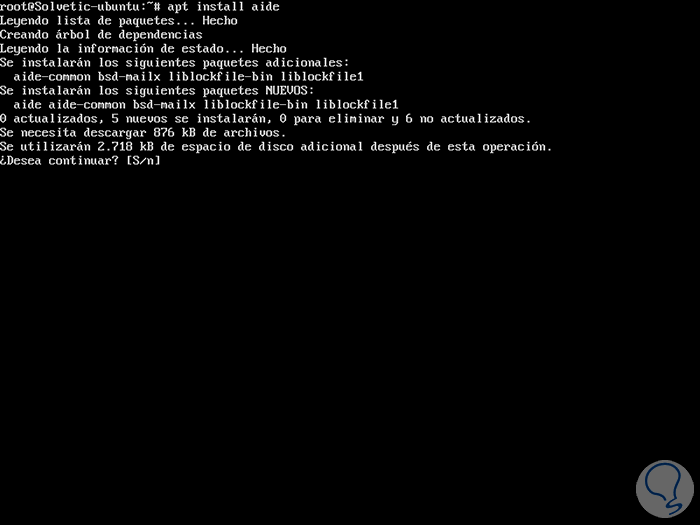 En este caso usamos Ubuntu. Allí ingresamos la letra S para aceptar la descarga e instalación de AIDE. Una vez instalada veremos lo siguiente:
