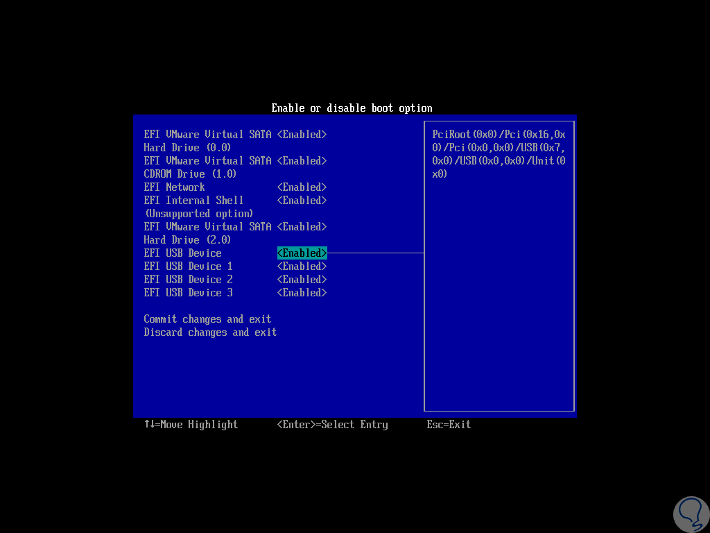 Seleccionamos la línea “Enable o disable boot option” y seremos redireccionados a todas las opciones de arranque del sistema: