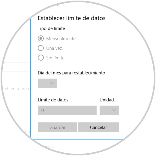 Si deseamos establecer un límite de datos, basta con pulsar en dicha opción y luego definir el periodo de tiempo así como el tamaño de dicho límite: