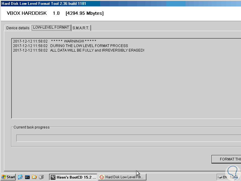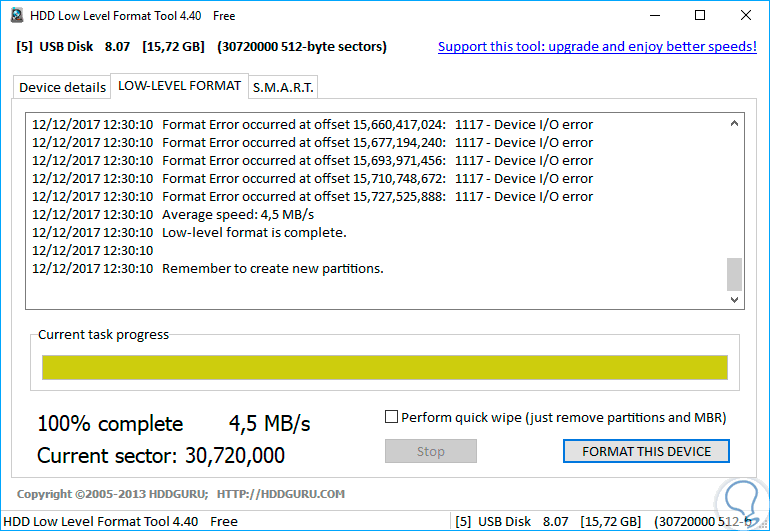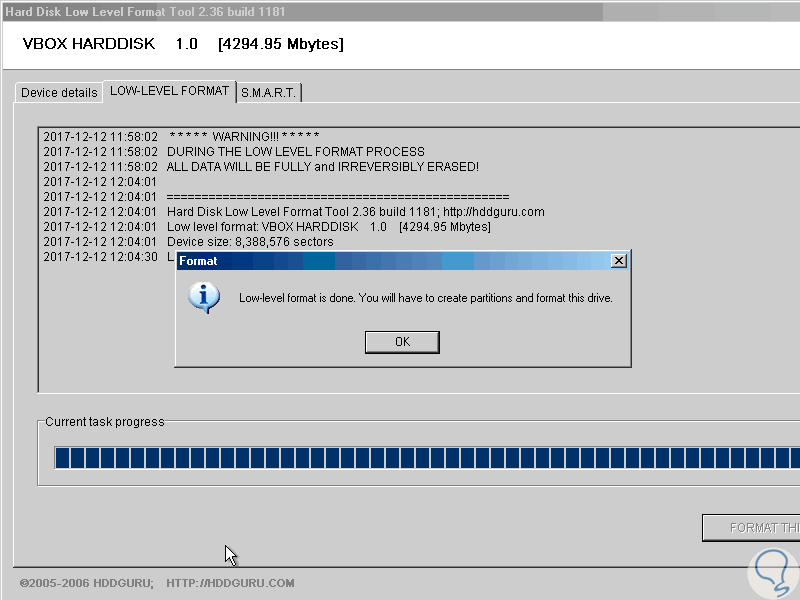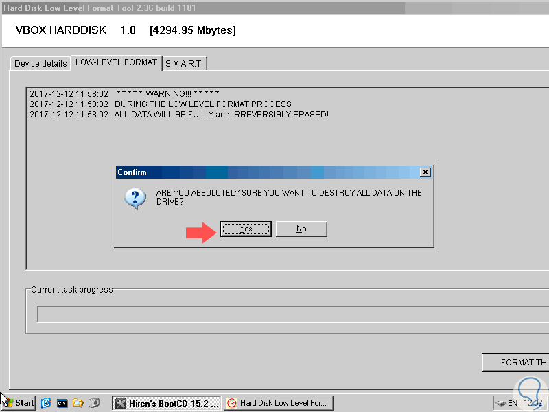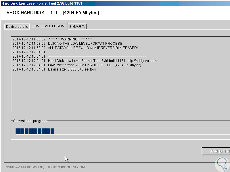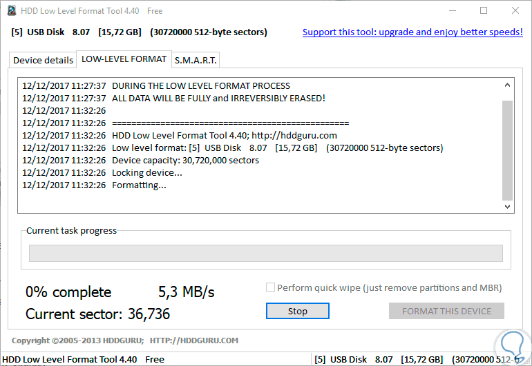 Si estamos seguros de la acción pulsamos en el botón Yes e iniciará el proceso de formato de bajo nivel a la unidad seleccionada: