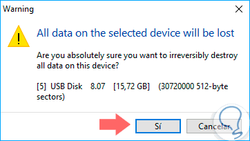 Recordemos que este proceso no tiene retroceso por lo cual debemos estar plenamente seguros de la acción a realizar así como de la unidad seleccionada. Para iniciar el proceso pulsamos en el botón “Format this device” y será lanzado el siguiente mensaje: