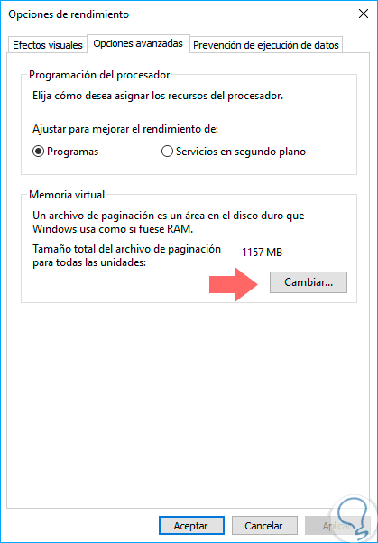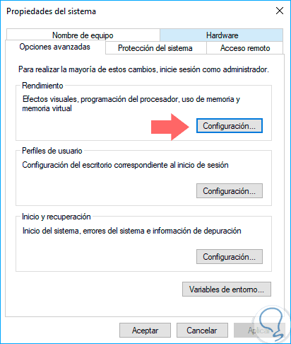 Allí pulsamos en el botón “Configuración” ubicado en la sección “Rendimiento” y en la nueva ventana vamos a la pestaña “Opciones avanzadas”: