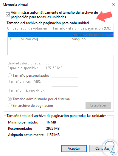 Procedemos a demarcar la casilla “Administrar automáticamente el tamaño del archivo de paginación para todas las unidades” y luego activar la casilla “Tamaño personalizado” e ingresar los valores mínimos y máximos en los campos respectivos, estos valores están representados en MB. Una vez definidos los valores pulsamos en los botones Aplicar y Aceptar para guardar los cambios.