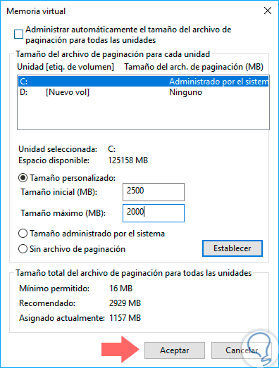 De este modo hemos definido un valor para el archivo de paginación teniendo en cuenta que el método automático puede usar más de la memoria RAM necesaria afectando la disponibilidad de esta.